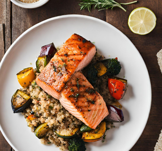 Baked salmon with quinoa, roasted eggplant, and a green salad